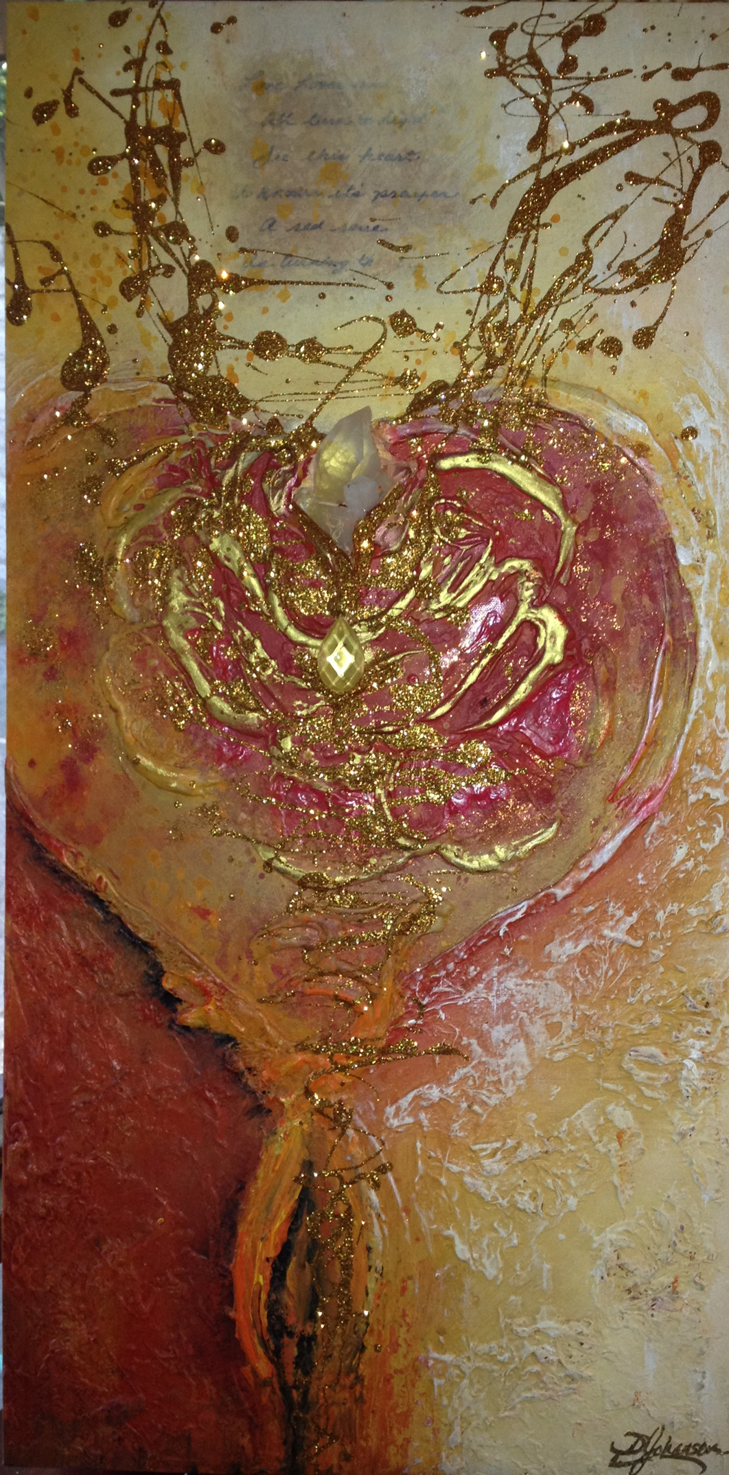 and realization of Divine Love. I use this art for meditation—for connecting to the divine space within. As you gaze at the painting, you see at the base of the heart is the mystical symbol OM, which represents the primordial sound resonating throughout the universe. A red rose in the center of the heart is fully bloomed showing the light within, as crystals of light. Above the heart is golden light enveloping the last stanza of the poem: