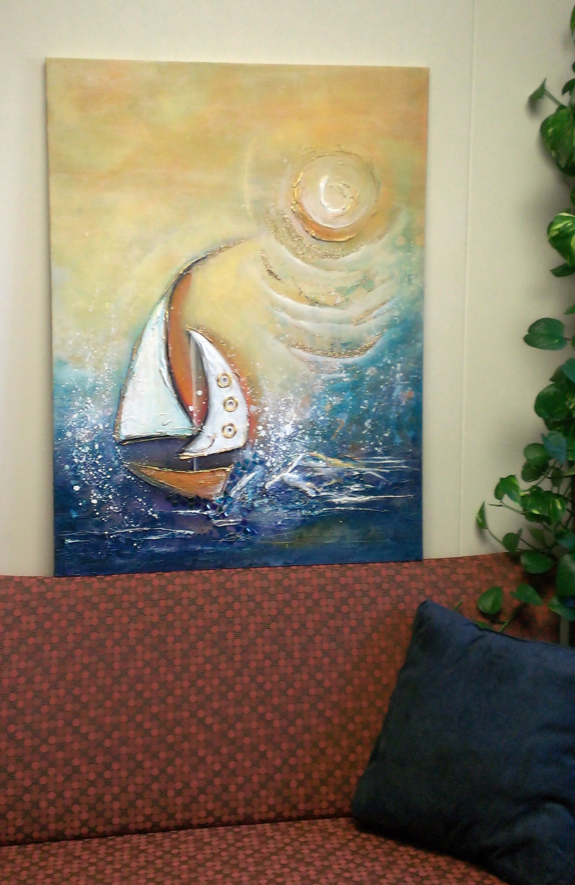 combat veterans for PTSD. (The sailboat is my motif, since my maiden name was ‘Sail’, and it is a wonderful metaphor for life.) Donna incorporated some very spiritual physical material into this painting, and you can feel the energy. My colleagues and my patients are drawn to this painting, and it just transforms the whole office. So far, my therapy seems more powerful and the results more clear.